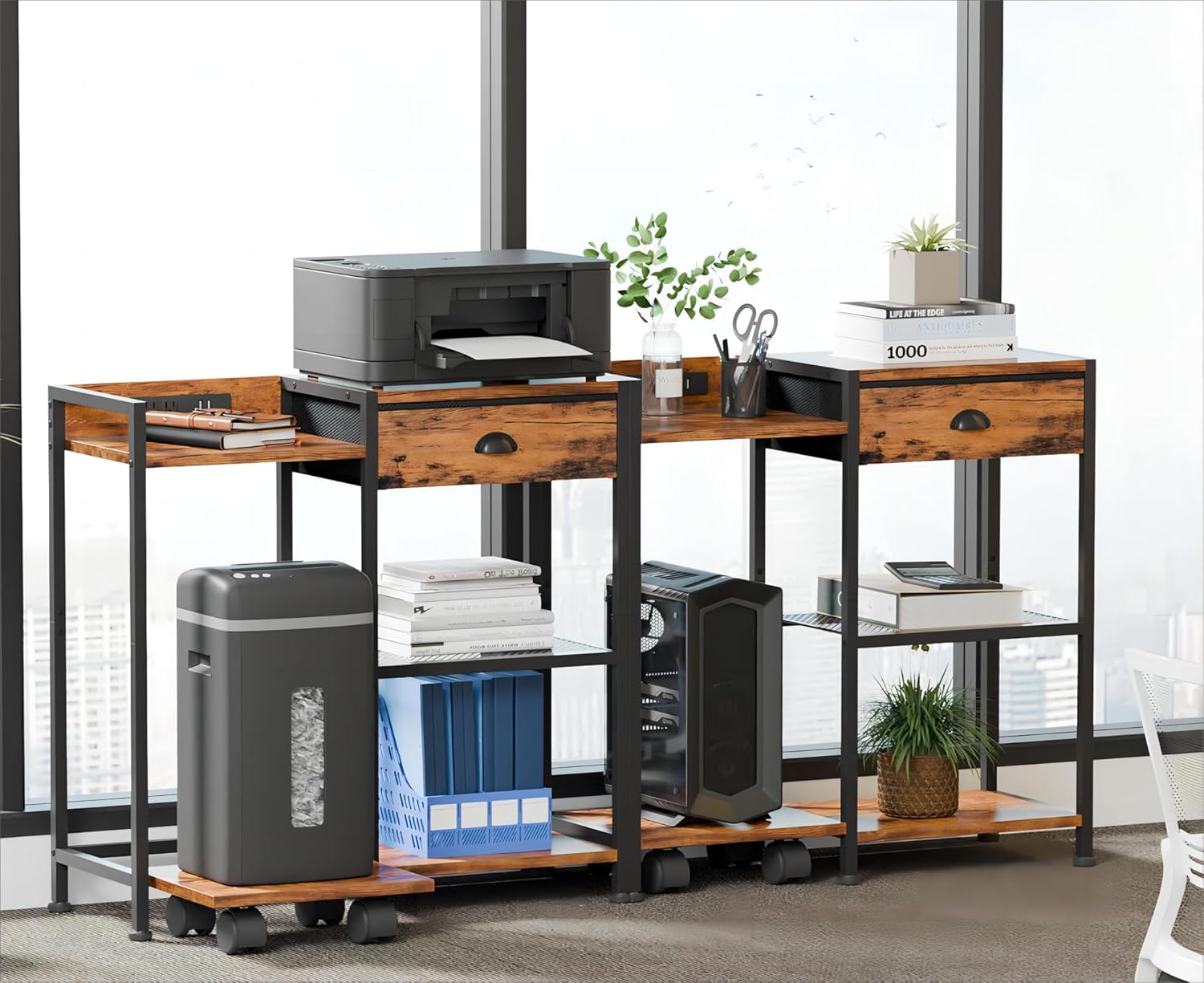 - 3 Tier Shelf and Shredder Stand:This printer table has 3 tier open shelves for storing printer paper, books and files, keep your room or office neat and organized.Equipped with a sliding spacious computer tower stand, it is also ideal for paper shredders.The sliders with wheels can be pulled out at any time and the wheels can be secured to prevent accidental rolling.