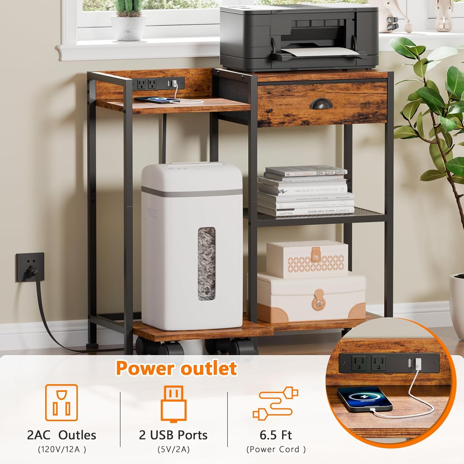 Furologee 3-Tier Printer Stand with Drawer, Charging Station & Wheels – Rustic Brown Printer Table with USB Ports for Home Office