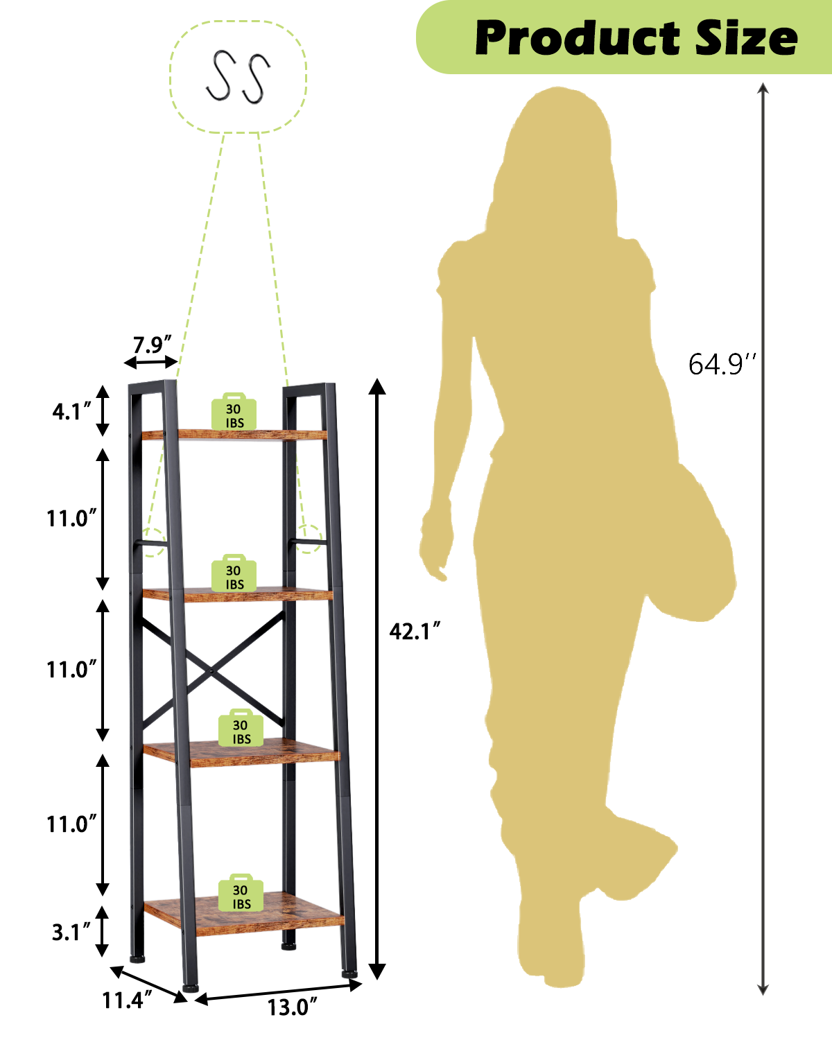 - Making the Most of Space: Occupying only 12.9“D*11.4”W of floor space with 4 tiers of vertical storage, this ladder shelf can help you make the most of tight spaces in and out of your room