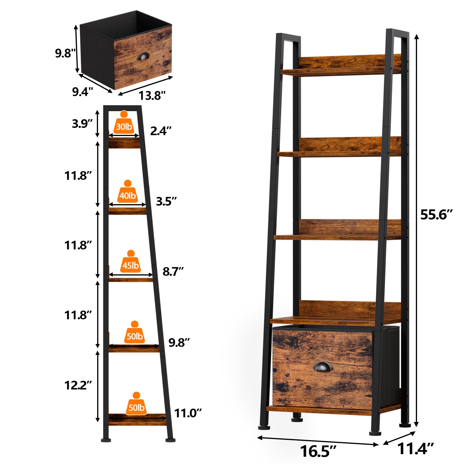 Multiple Choices & Industrial Style: Available in two sizes (4-tier and 5-tier) and three colors (rustic brown, black oak, and white). The industrial design blends practicality with a vintage look, making it a stylish addition to any room.