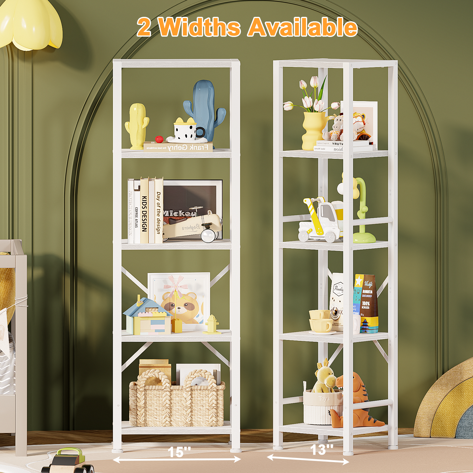 - [Display & Large Storage]: White 5 tier shelving units provides plenty of storage space, you can also use to display your favorite books, CDs, crafts, photo albums, potted plants, basket, toys, collectibles, ect. Ideal room decor and organizer furniture!