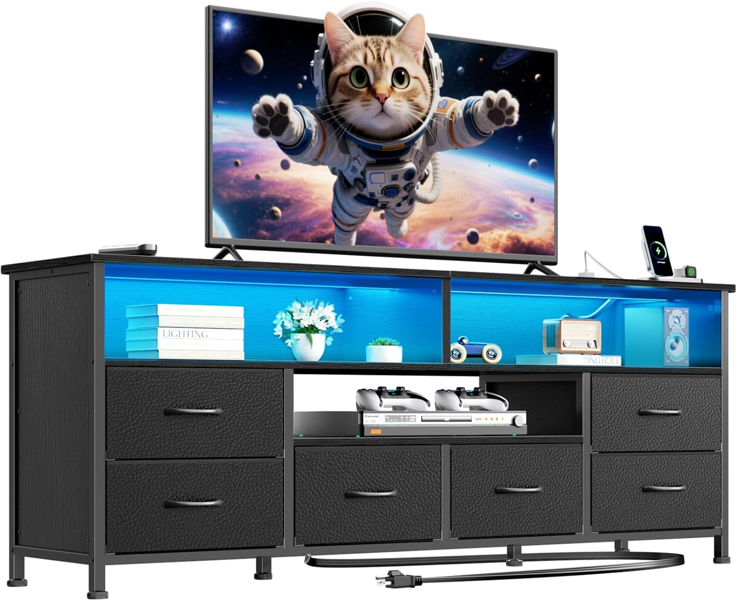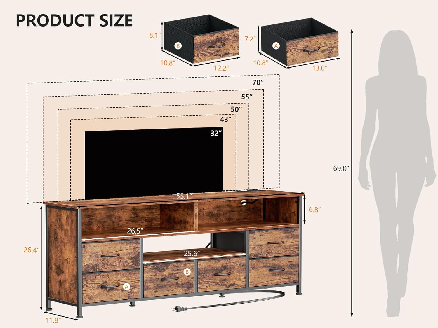 - Ample 6 Storage Drawers: TV stands for living room with a large capacity, 3 open storage compartments and 6 large-capacity fabric drawers design meet your classified storage needs. The wooden top is very suitable for placing TVS up to 60 inches and frequently used items