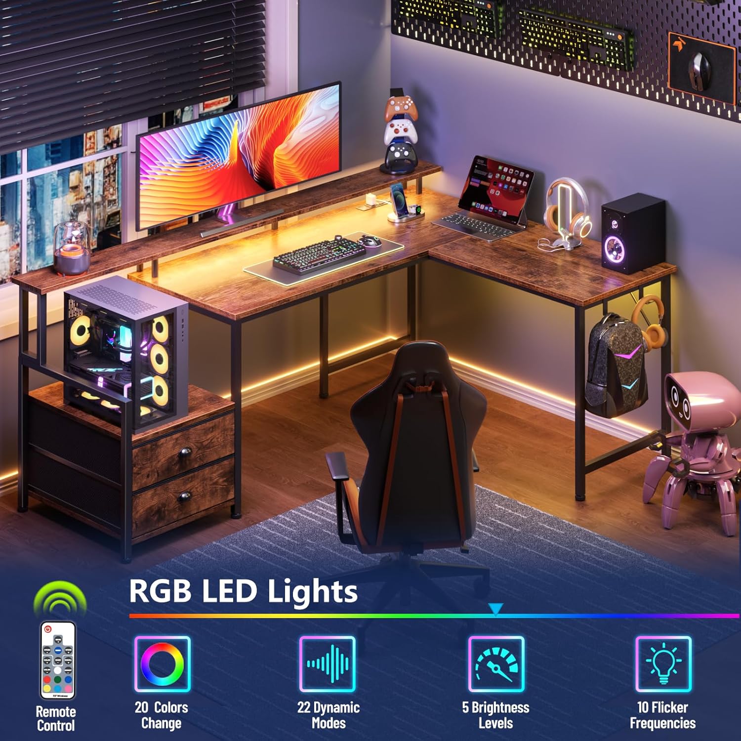 - L Desk with Colorful LED Lights: This gaming table equipped with LED RGB lighting with 20 colors, 22 modes, 5 adjustable brightness levels. You can choose any mode and color to decorate your home office,creating a cooler gaming atmosphere.