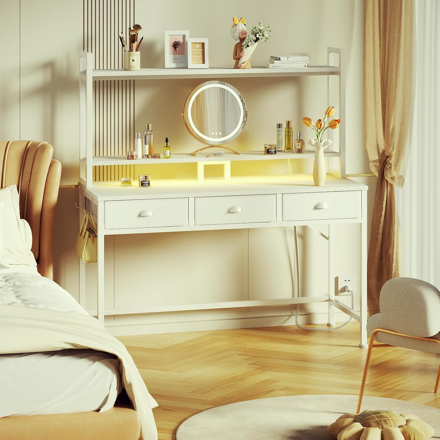 - [Vanity Desk for Bedroom]:The small vanity desk combines functionality and style, making it an ideal space-saving solution for bedrooms and dorms, perfect for students and teens. Additionally, it features 4 adjustable feet that keep the desk stable on uneven ground and protect the floor from scratches. It also includes safety anti-tip kits, providing a safer environment for your kids and pets!